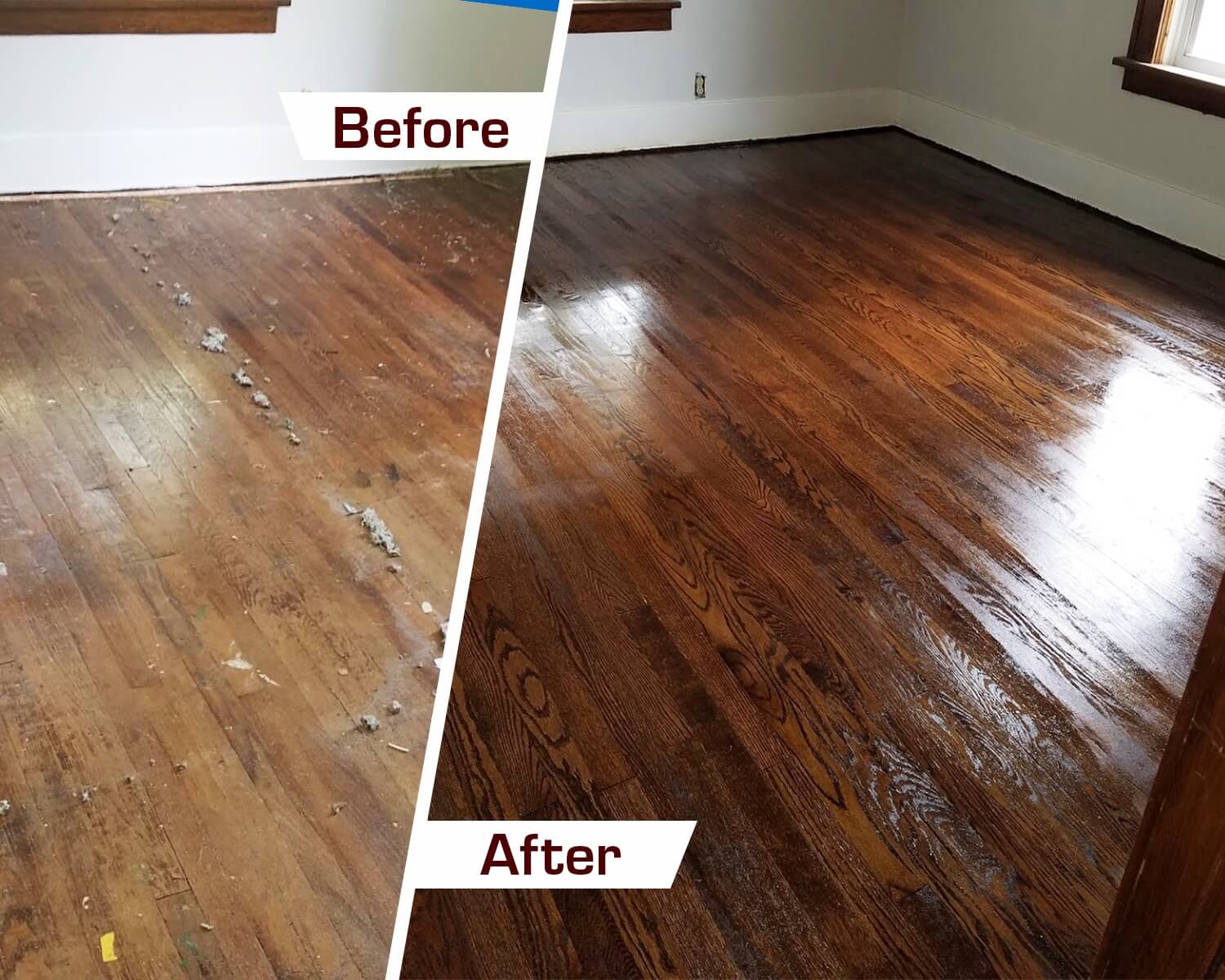 Hardwood floor refinishing - this is the heavy duty wood floor makeover. It often involves a lot of sanding work to remove scratches, dents and nicks that have formed on the wood floor due to normal traffic, pets, moving furniture and daily use over several years time. We will sand down your floors to remove those imperfections. We also may reinforce wood planks that are pulling up or have partially lifted nails. We will have to level the floor after our scratch removal is completed so that the floor is nice and even. Once the floor is even and surface imperfections have been carefully sanded away, we will clean your hardwood floors to remove the dust and debris, apply a fresh stain to the wood and lastly, apply a new polyurethane coat to seal in and protect the wood from things like moisture.